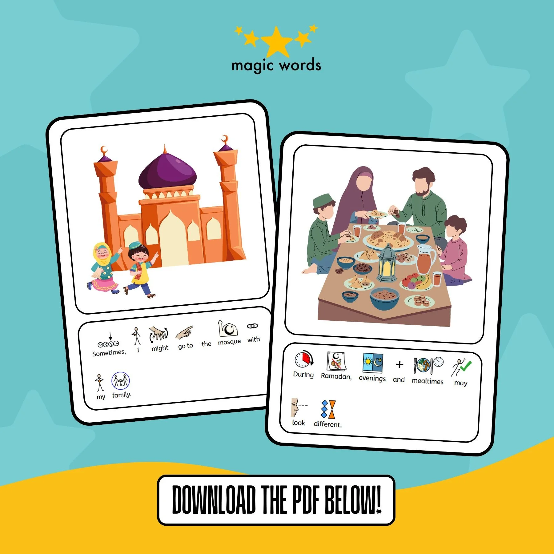 Imaan. M (Senior Speech and Language Therapist from our Archway clinic) created this free downloadable Social Story using Widgit that you can use with your child to help them better understand changes that may happen during Ramadan and how families do things a little bit differently throughout the holy month.