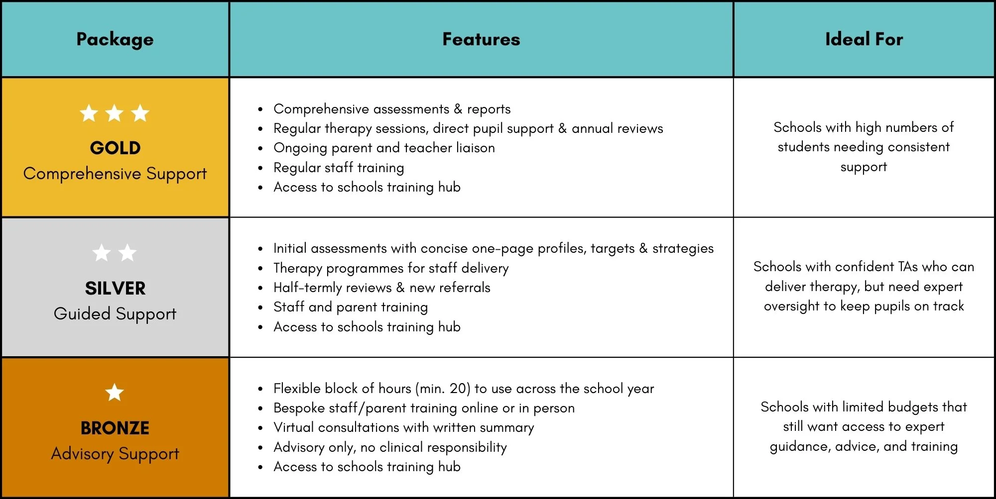 Our Gold package includes full assessments, detailed reports, regular therapy, annual reviews, and direct student work, with the therapist holding full clinical responsibility. Recommended at 20 students per day per week, it also covers parent/teacher liaison, staff training, and year-round referrals (subject to capacity). Service is face-to-face on scheduled days; extra time may incur charges.